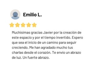 “Llevo muchos años caminando en esta senda y he conocido a muchas personas, pero una muy especial es Javier. El mensaje que comparte transciende lo que comprendemos muchas veces como “humanos” y siempre ayuda a comprender el porqué de las cosas. Su formación debería de pasar por todos y cada uno de nosotros.”